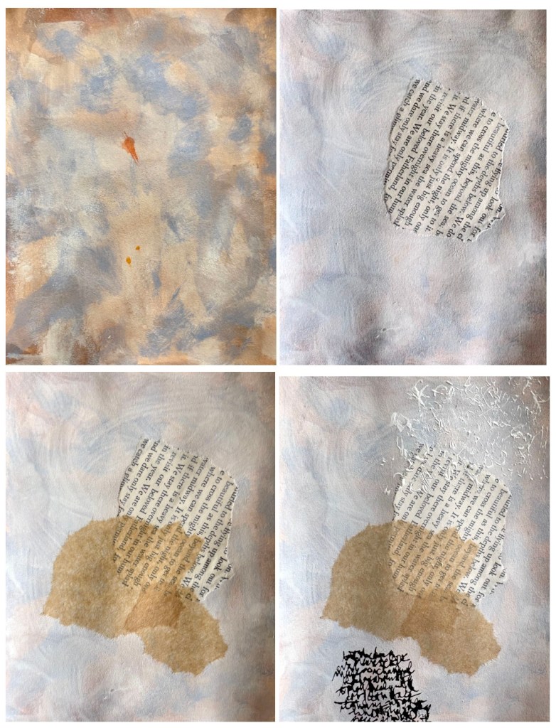 • I started The Friend Who Knits with a scrap of paper sporting an existing chaos layer, whitewashed it with gesso, added print and tissue paper collage, and scribbled some asemic writing before I lost track of taking process photos!