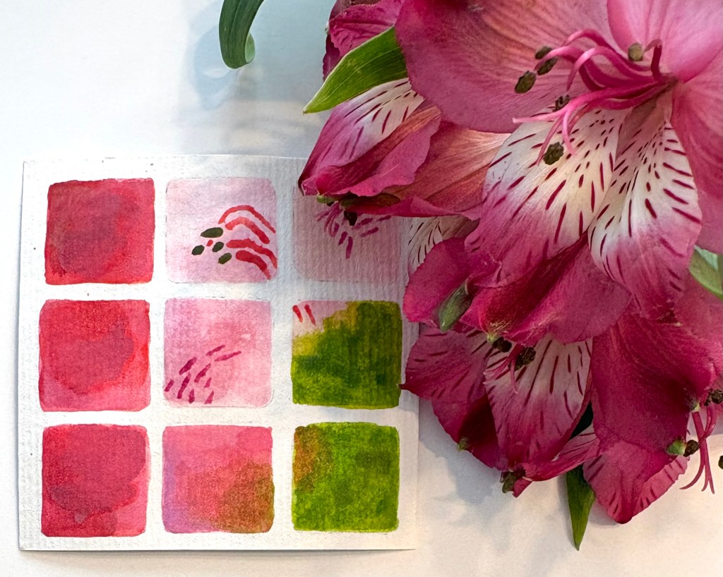 • Granddaughter Emmy turned sweet 16 at the tail end of January, and a friend of hers gave her a lovely vase full of cut flowers featuring lush vibrant alstroemeria. What’s a G’ma to do if not paint up some corresponding Sweet Sixteen color swatches?!