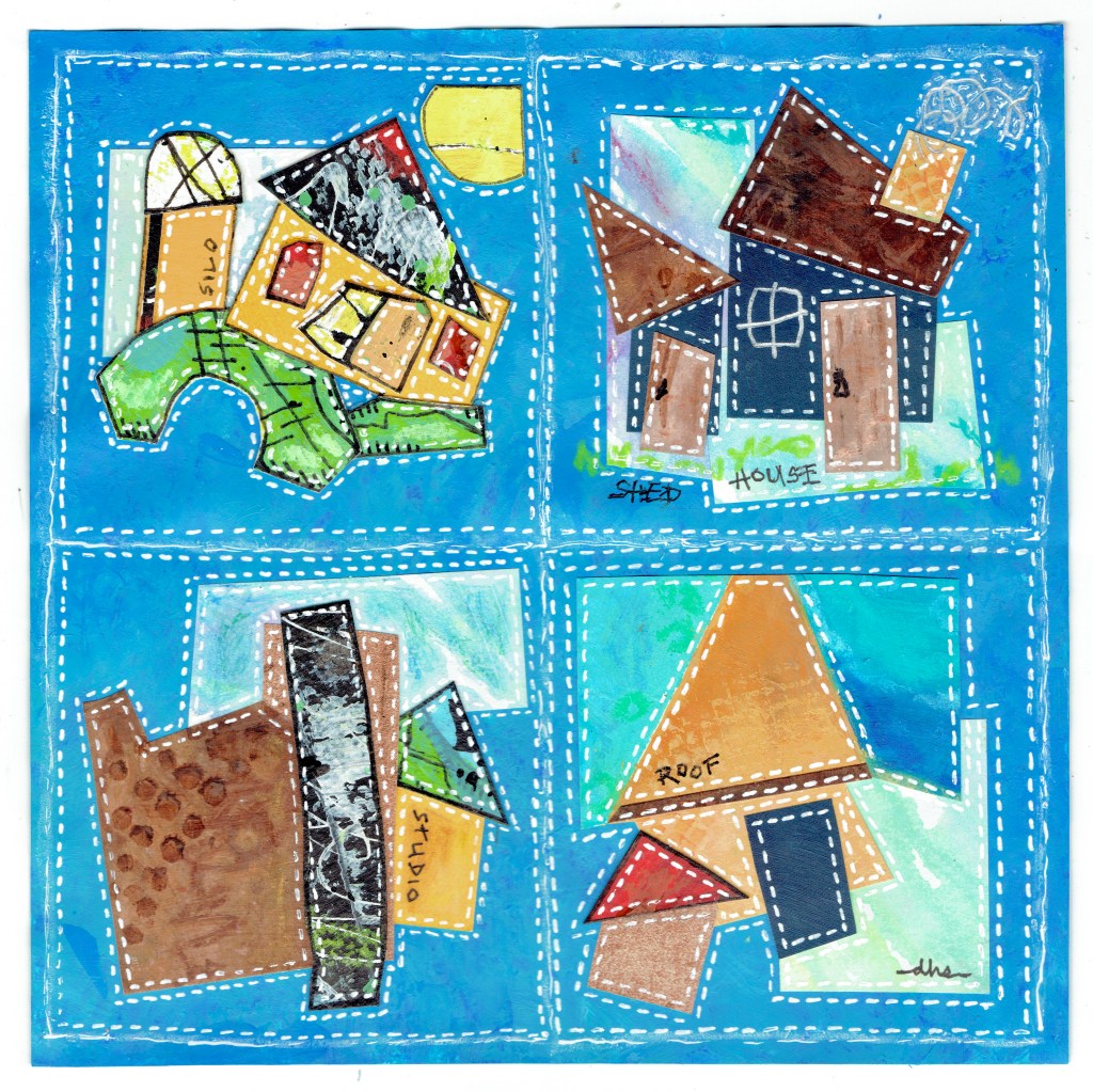 • In the final addition (bottom right) to my Le’ts Play House four-patch of collaged house imagery, I also took the opportunity to spring clean, staying with simple shapes free from clutter.