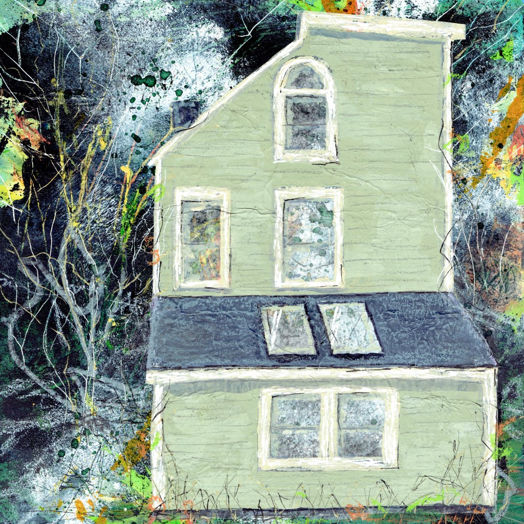 On This Earth at This Moment is a distinct departure from the house images that have thus far taken up real estate in my current Make Yourself at Home series, a series that continues to be on its way to becoming whatever the heck it will become! On This Earth was an experiment—I started with a 2015 6×6″ acrylic painting on gessobord that I had subsequently painted over in 2021 with chaos layers. With the old iterations as a base, I used a photo reference taken recently in Newburyport, MA, to make an acrylic painting on sandwich wrap which I then collaged onto the gessobord. By responding to whatever emerged, one step after another—many of which dismayed me, this piece became a painting of surprising visual interest to me.