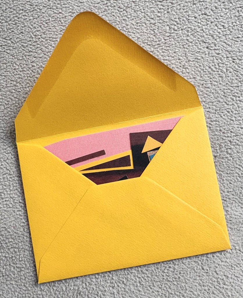 It occurs to me after a bit that I could open my new Joy Journal to scout out a suitable pocket and—oh my gosh—I find a pocket holding a tiny envelope that is JUST the right size for No Need and is JUST the same yellow as that which appears in No Need!