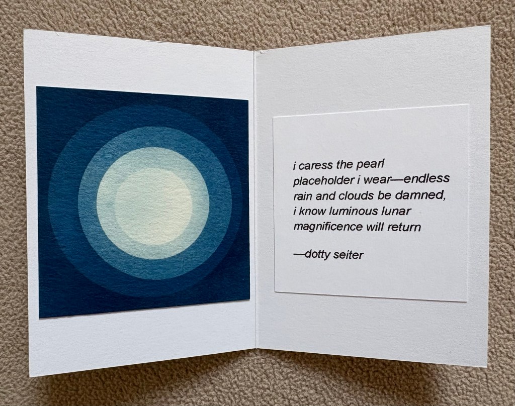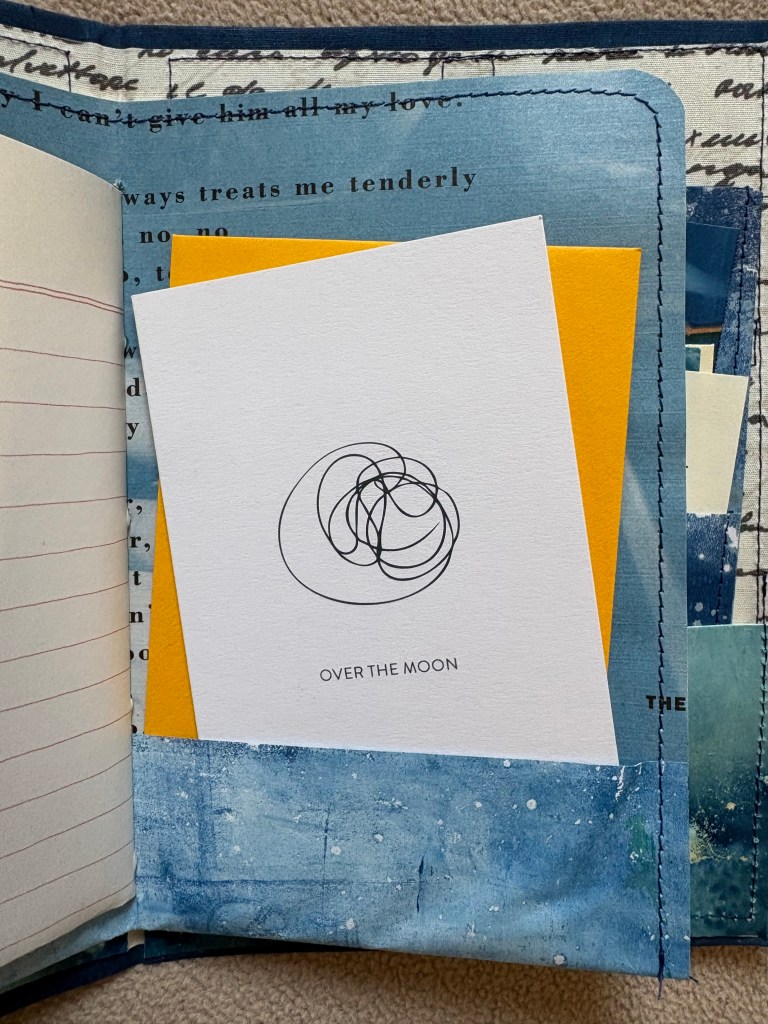 I take SUCH delight in affixing the moon cyanotype on the left interior side of the blank card, affixing a printed copy of my moon tanka on the facing side, and then tucking the card into the pocket with my enveloped art. As I merge my writing and art with MaryAnn’s maker magic, I take part in keeping this Joy Journal a living creation.